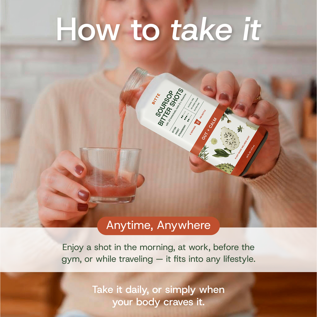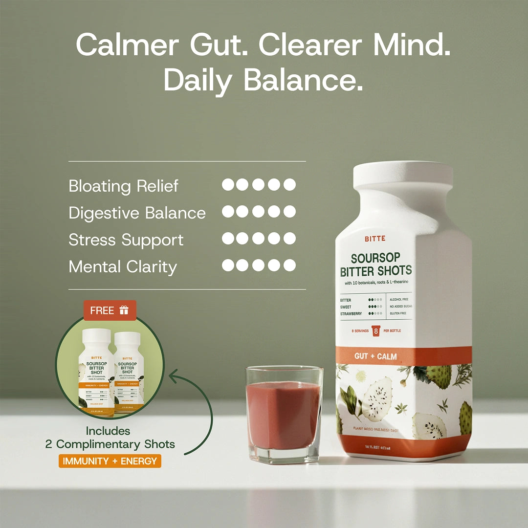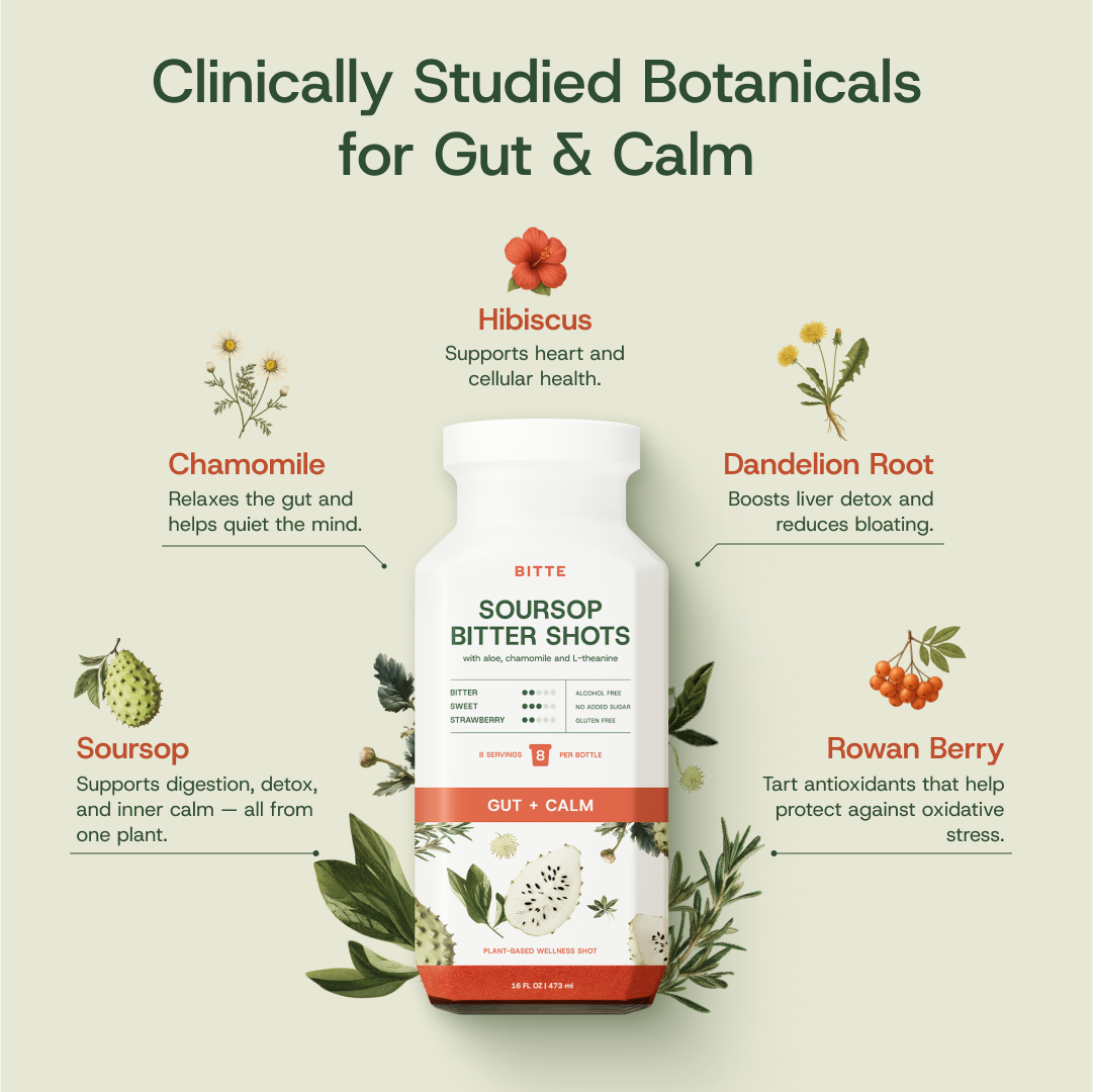 Bitte is a next-generation wellness shot designed for gut and nervous system support. Made with whole-plant soursop — including the whole fruit, leaf, and root — it’s blended with a refined matrix of calming herbs, adaptogens, and functional roots.
