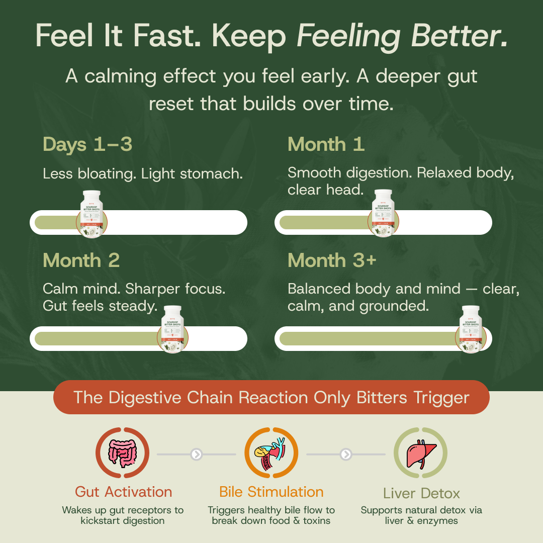 It goes beyond just bloating relief. Bitte Soursop Bitters help reset your gut by supporting a healthy microbiome, so your digestion works smoother, your body feels lighter, and your mind stays calm and clear.